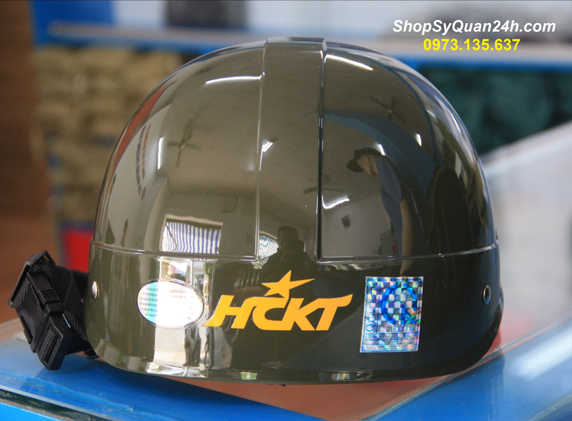 Phía sau mũ có chữ HCKT phản quan ban đêm và tem chống hàng giả